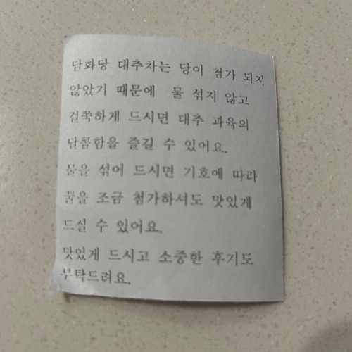 첨가물이 없는 재료 원액 그대로의 대추차여서 너무 좋았고, 맛 또한 너무 훌륭했다. 그냥 꺼내서 전자레인지에 조금 데워서 바로 마셔도 되고, 따뜻한 물 부워서 바로 마셔도 되니, 마시기도 너무 간편하다.
