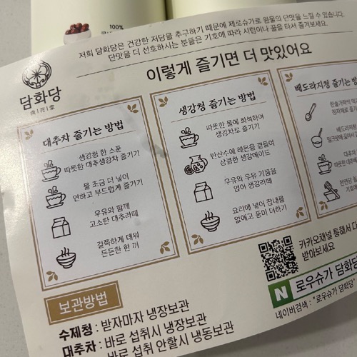 달달하게 먹고 싶으면 꿀을 좀 더 타서 먹으면 될 것 같고, 설명서에 나와있는 것 처럼 생강청을 넣어서 먹으면 생강청의 단맛하고 어우러져마실 수도 있을 것 같다.